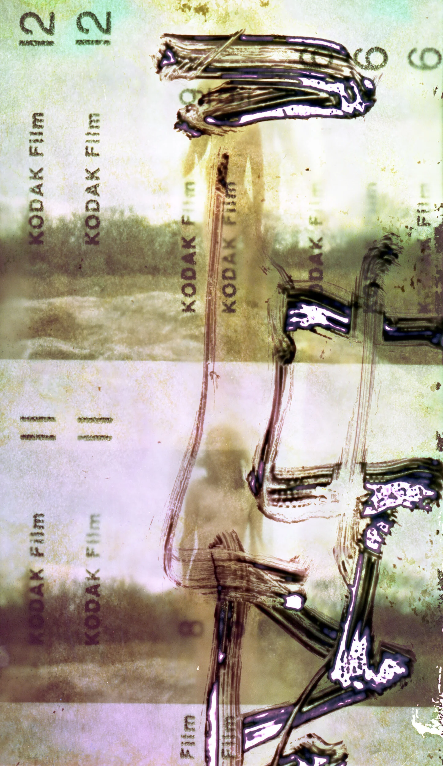 Integrating Christian thought and framing this work through Genesis emerged as the creative process progressed. Paint represents the artistic nature of God while semen represents the creation of new life. Acrylic paint and semen were applied onto unexposed film. The immersion in and out of the developing solution was reminiscent of baptism. A believer goes into baptismal waters devoid of spiritual life and is resurrected into a new creation. Similarly, the negatives were immersed having no image and emerged with newness of life.